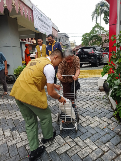 Warga Glodok yang mulai berdatangan pun disambut dengan senyum ramah oleh relawan Tzu Chi. Sebanyak 22 relawan yang bertugas hari ini menempati posisi masing masing dan siap menjaga alur jalan warga yang datang supaya tertib. Untuk para penerima bantuan Lansia, relawan Tzu Chi juga sigap membantu membawakan karung sampai ke rumah.