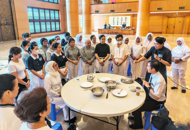 Didampingi Stephen, Melliza mengenalkan tata cara makan dalam budaya humanis Tzu Chi secara langsung kepada peserta di Lobi Fu Hui Ting.