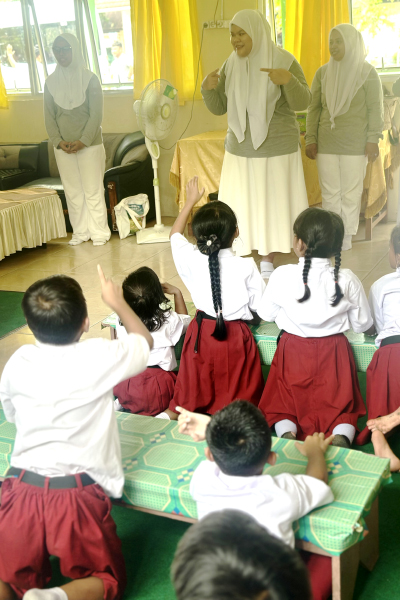 Tampak anak-anak dengan antusias mengangkat tangan, berebut menjawab pertanyaan yang diajukan oleh Riezka.