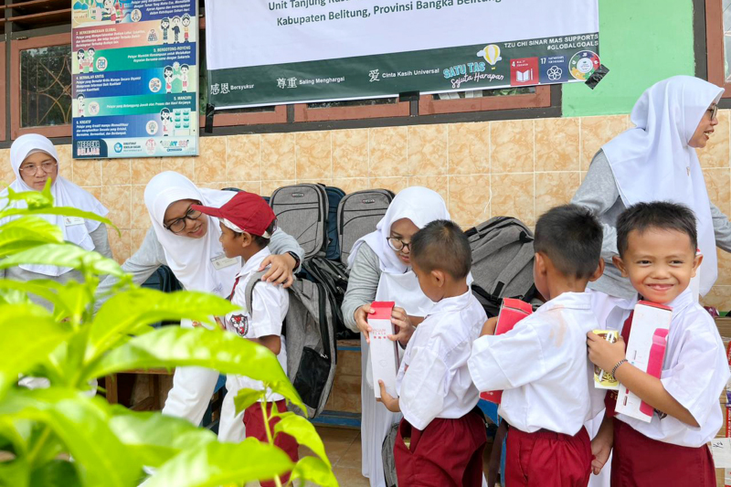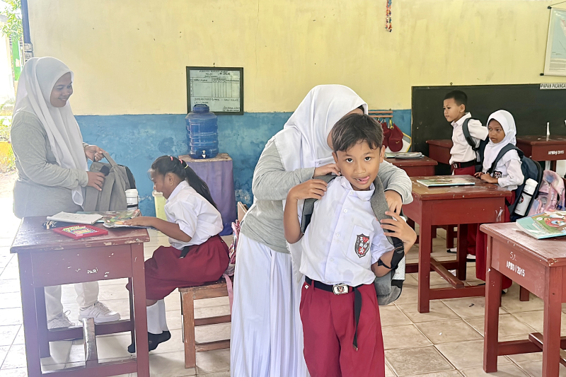 Satu per satu, anak-anak dipakaikan tas oleh para relawan dengan penuh kasih sayang, disaksikan langsung oleh guru dan kepala sekolah. “Rajin-rajin belajar ya nak, buat bangga umak kan ayah (ibu dan ayah),” pesan Rumiati sambil memakaikan tas kepada salah satu siswa.