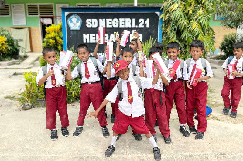 Siswa-siswi SDN 21 menunjukkan tas dan botol minum baru mereka dengan wajah ceria usai menerima bantuan.