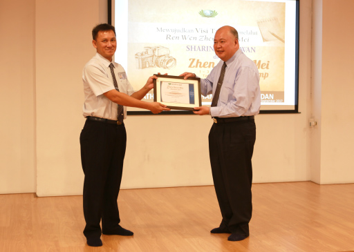 Penyerahan penghargaan dari Yayasan Buddha Tzu Chi Indonesia kepada ketua Tzu Chi Medan, Mujianto. Penghargaan tersebut adalah penghargaan atas semangat relawan Zhen Shan Mei Tzu Chi Medan dalam mencatat sejarah Tzu Chi.