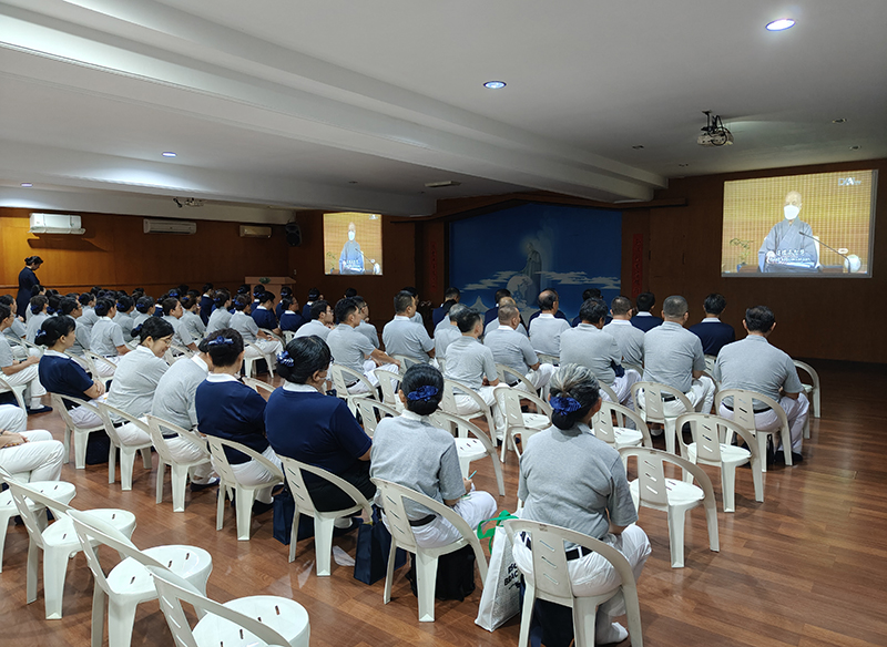Para relawan peserta Pelatihan Administrasi Misi Amal di Tzu Chi Medan mendengarkan Ceramah Master Cheng Yen sebelum pembekalan materi.