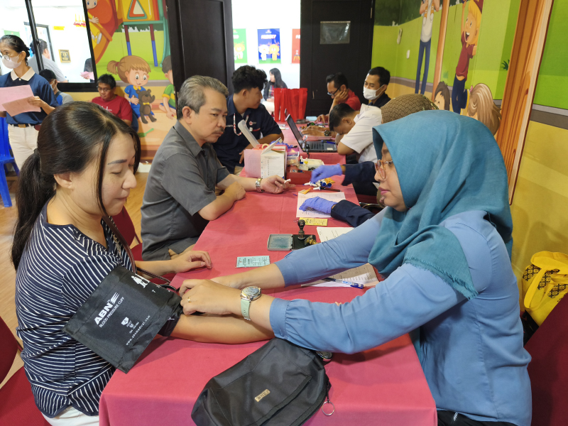 Para calon pendonor menjalani proses skrining kesehatan berupa pemeriksaan tekanan darah sebelum mengikuti kegiatan donor darah. Tahap ini dilakukan oleh petugas medis untuk memastikan kondisi kesehatan pendonor.