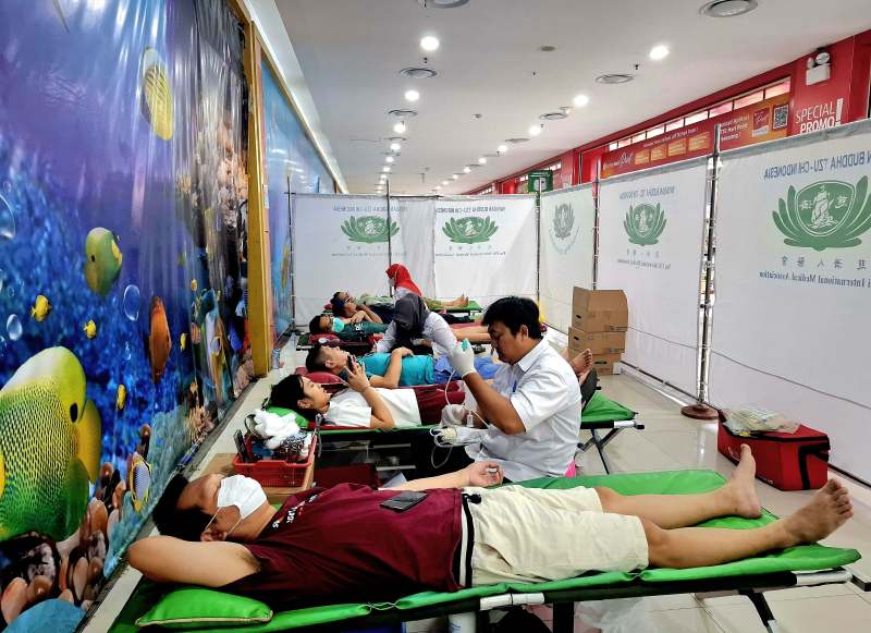 Masyarakat mengikuti kegiatan donor darah yang diadakan relawan Tzu Chi komunitas He Qi Barat 1 di Lotte Mart, Taman Surya.