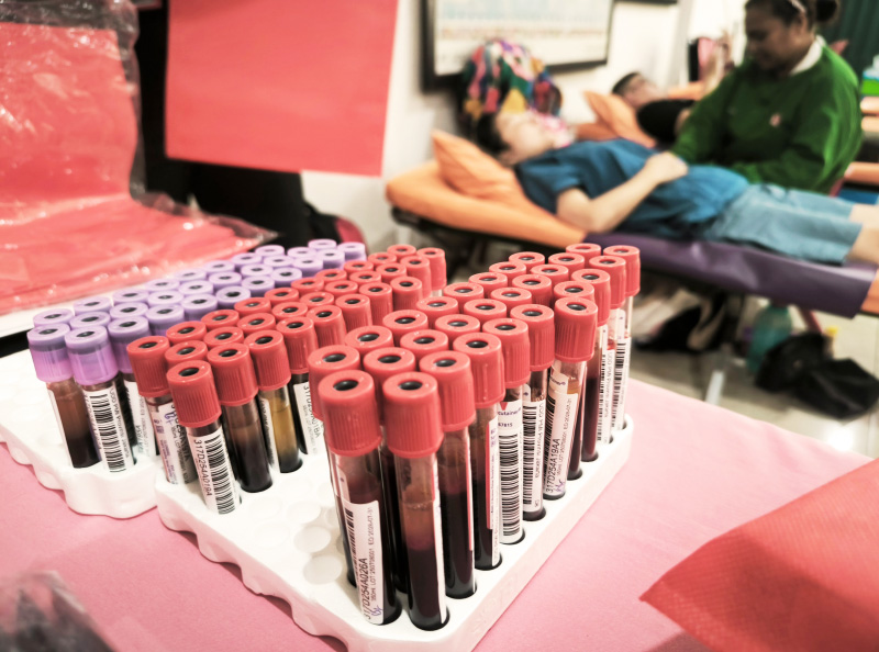 Tabung sampel darah pendonor digunakan untuk pengujian golongan darah, rhesus, serta skrining penyakit menular dalam kegiatan donor darah yang diselenggarakan oleh relawan Yayasan Tzu Chi komunitas Hu Ai Pluit Mas bekerja sama dengan PMI Kotamadya Jakarta Pusat dan Yayasan Tunggal Andal di Gedung Yayasan Tunggal Andal, Penjaringan, Jakarta Utara.