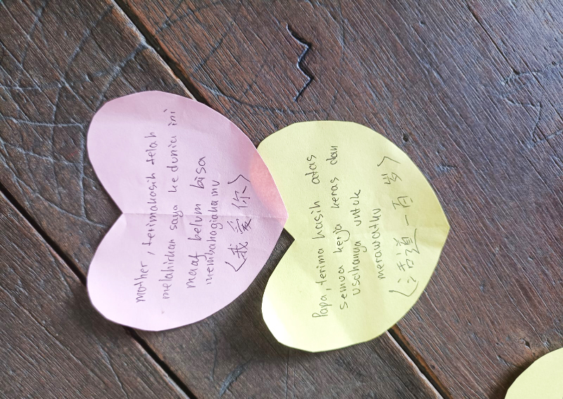 Kertas pesan berbentuk hati yang ditulis para siswa untuk orang tuanya. Tulisan berisi doa dan harapan untuk kedua orang tuanya.