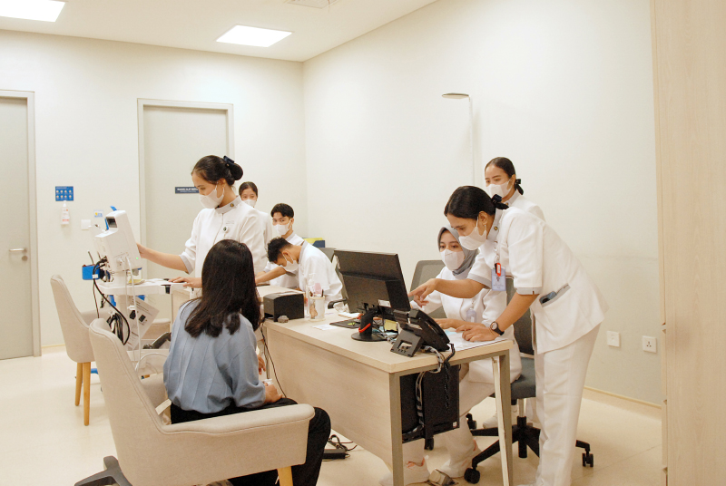 Susi (depan) kini bertugas sebagai perawat rawat jalan (OPD) di lantai 6 Tzu Chi Hospital. Dengan senyum hangat dan hati yang tulus, ia melayani setiap pasien yang datang.