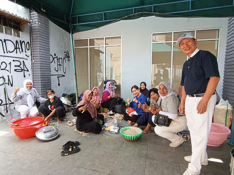 Relawan Tzu Chi Tangerang berkoordinasi dengan pengelola dapur umum saat penyaluran bantuan bagi warga terdampak banjir Priuk.