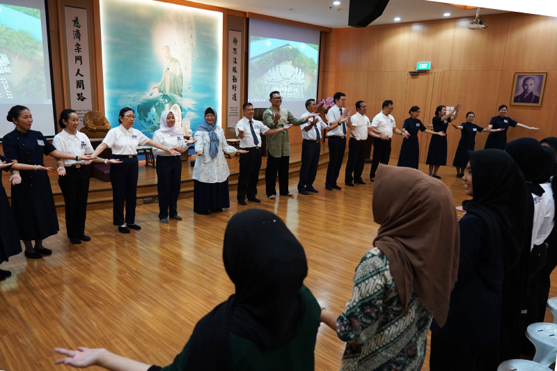 Relawan, anggota TIMA, dan perwakilan UIB bersama-sama memperagakan bahasa isyarat tangan dengan judul “Satu Keluarga”. Bahasa isyarat tangan ini merupakan salahsatu budaya humanis Tzu Chi sebagai simbol kebersamaan dan cinta kasih universal.