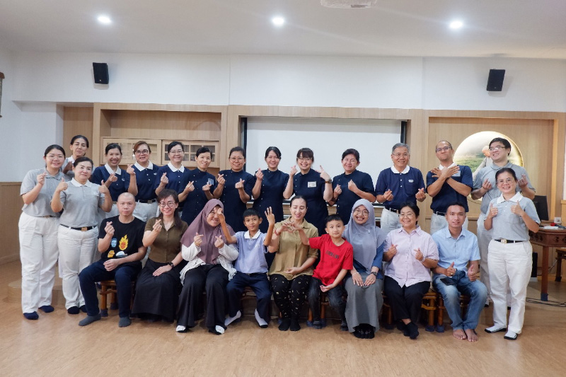 Fiona (paling kiri), selaku koordinator acara, berfoto bersama para relawan Tzu Chi dan peserta sosialisasi. Wajah-wajah bahagia mereka memancarkan semangat kebersamaan dan cinta kasih yang menghangatkan suasana di akhir kegiatan.