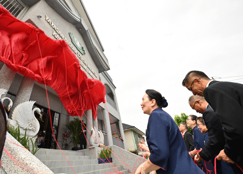 Para relawan menarik kain selubung merah sebagai tanda diresmikannya Kantor Penghubung Tzu Chi Jambi pada Minggu, 8 Maret 2026.