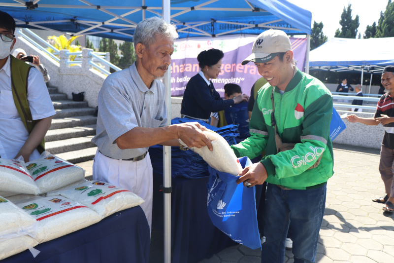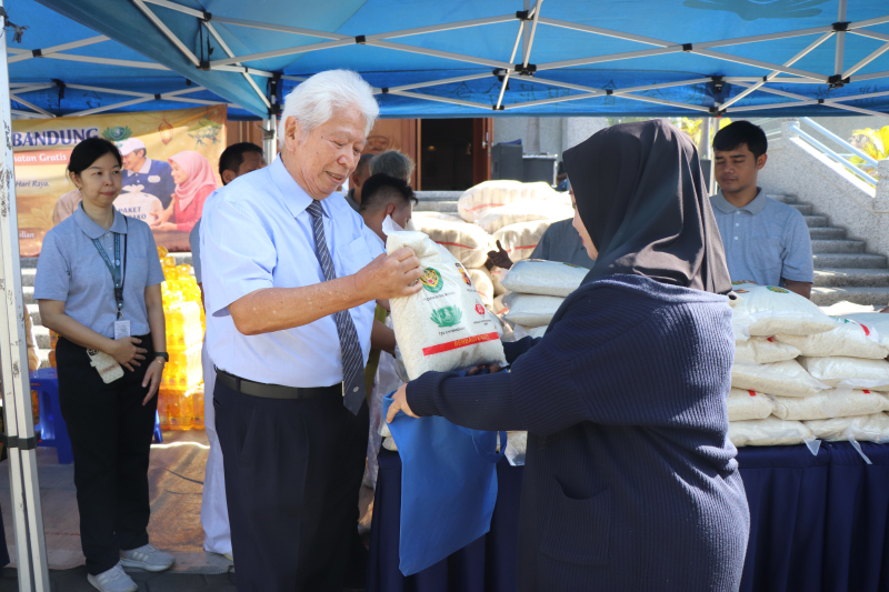 Djoni Andhella, Ketua Tzu Chi Bandung, menyerahkan beras 5 kg kepada warga penerima bantuan dalam kegiatan pembagian paket sembako Lebaran 2026.