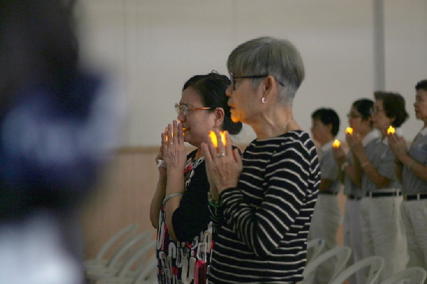 Kwiniwati (65) peserta Kelas Memasak Vegetaris merasa tersentuh saat sesi berdoa.