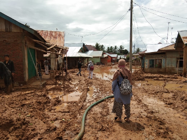 “Sebanyak 107 kepala keluarga tinggal di sini, hujan dari Jumat pagi sampai Sabtu dalam hitungan detik air bisa mencapai atap rumah,semua rumah terendam air dan lumpur termasuk 1 sekolah, semua warga mengungsi ke perkebunan karet. Alhamdulillah warga kami selamat semua,” tutur Nasrun, kepala desa setempat.