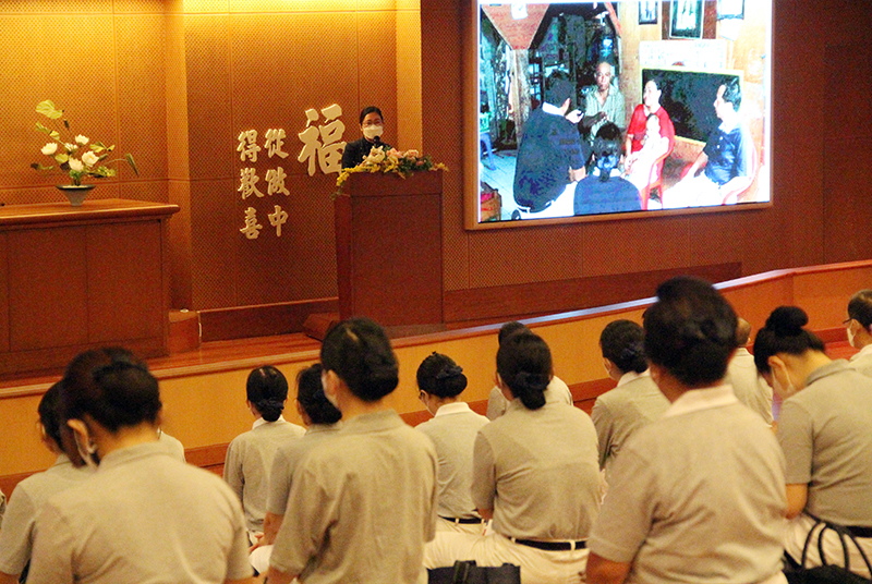 Amelia menjelaskan bagaimana Master Cheng Yen mengajak relawan mempraktikkan budaya humanis Tzu Chi: “Bersyukur, Menghormati, Mencintai”.