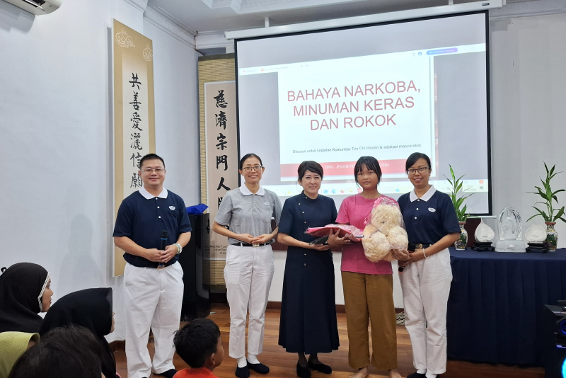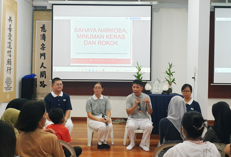 Relawan Tzu Chi Medan, Jumin membawa pesan kepada para hadirin untuk senantiasa waspada dengan efek yang disebabkan oleh narkoba, minuman keras dan rokok.