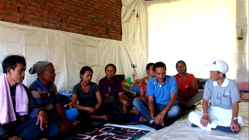 Salah satu pengungsi di posko Desa Kubu, Wayan Berata (berbaju biru) menjelaskan kondisi dirinya dan pengungsi.
