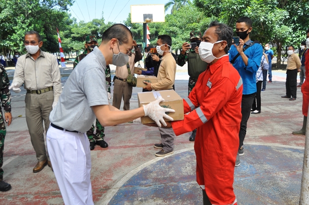 Henking Wargana, Wakil Ketua Tzu Chi Bandung secara simbolis menyerahkan paket sembako kepada warga penerima bantuan. Sebanyak 500 paket sembako dibagikan kepada warga.