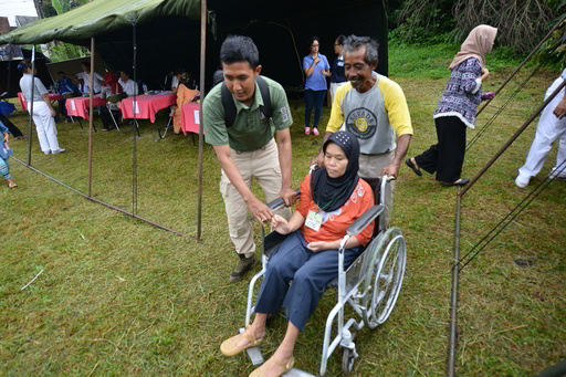 datang menggunakan kursi roda sedikit kesulitan karena lokasi baksos di rumput