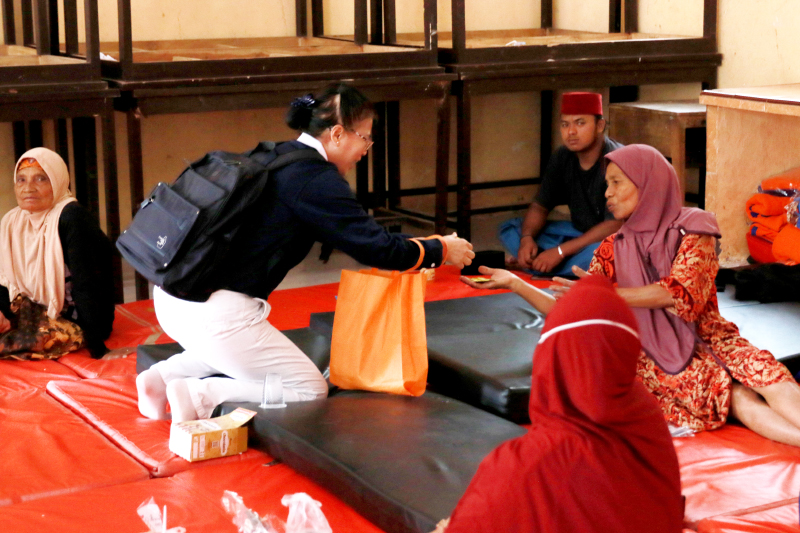 Relawan mendatangi setiap ruang kelas yang kini difungsikan sebagai kamar pengungsian bagi warga terdampak. Dengan penuh kepedulian, mereka membagikan snack serta obat herbal sambil memastikan kondisi para pengungsi.