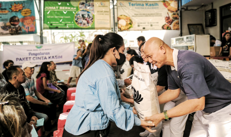 Saat menyerahkan paket beras, Melia Tjhung dan Liu Su Khiong (kanan) berbagi senyum, memperlihatkan kepedulian yang tulus dan menyentuh hati.