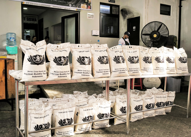 Paket beras yang tertata rapi di teras GBI Amanat Agung mencerminkan budaya humanis Tzu Chi yang menghargai penerima dan setiap bantuan yang diberikan.
