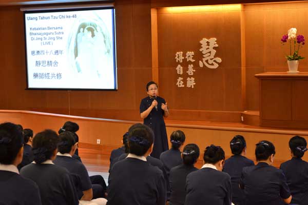 Seusai kebaktian dilaksanakan, Liu Su Mei, Ketua Tzu Chi Indonesia memberikan beberapa kata kepada para relawan yang hadir. Liu Su Mei menerangkan jika hari itu adalah hari ulang tahun Yayasan Buddha Tzu Chi yang ke-48, dan juga hari ulang tahun Master Cheng Yen yang ke-78. Liu Su Mei mengajak para relawan menggunakan hati yang tulus dan penuh hormat, mendoakan supaya Master panjang umur, semoga roda Dharma Master berputar selamanya. “Master berpesan bahwa 4 Misi di Indonesia memang telah terlaksana dengan baik, tapi kita harus menggalang lebih banyak Bodhisatwa(donatur), dan menggalang relawan setempat. Apabila kita bisa melaksanakan dua poin ini bisa disebut murid yang tidak membuat Master khawatir, jadi pesan Master benar-benar harus kita laksanakan. Marilah kita berusaha bersama, terimakasih semuanya,” ujar Liu Su Mei.