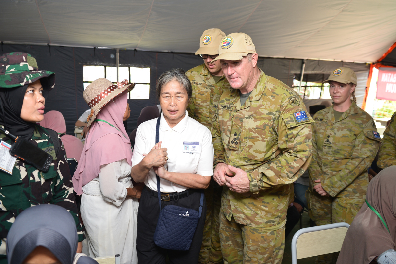 Wakil Ketua Harian Tzu Chi International Medical Association (TIMA) Indonesia, dr. Ruth O. Anggraeni (tengah), mendampingi salah satu Prajurit Australian Defence Force (ADF) untuk berkeliling tenda baksos kesehatan dilakukan.