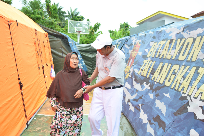 Edi Sheen, relawan Tzu Chi Indonesia, melakukan koordinasi dengan salah satu Prajurit TNI dengan penuh keramahan.