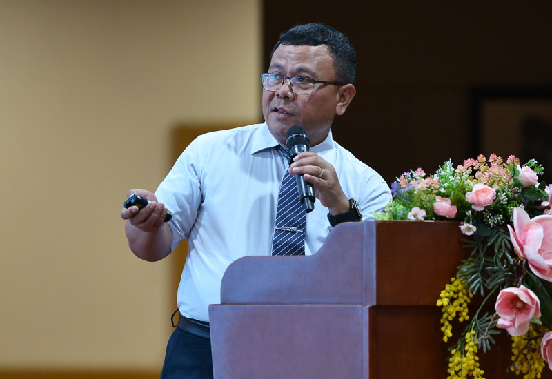 Relawan senior Tzu Chi, Hadi Pranoto memberikan materi inspiratif tentang bagaimana memanfaatkan media sosial dan teknologi digital secara bijak untuk menebarkan nilai-nilai kemanusiaan.